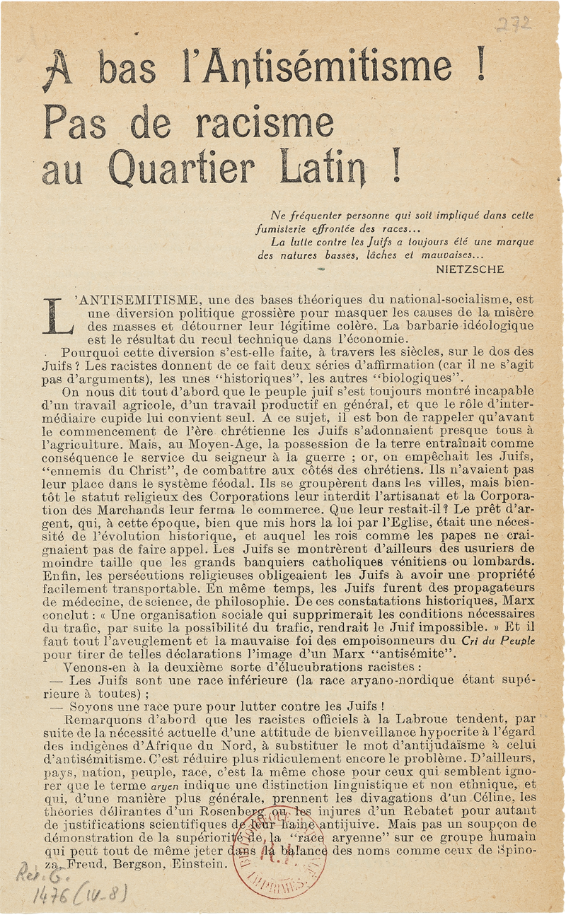 À bas l’antisémitisme ! Pas de racisme au Quartier latin ! Anonyme. [Paris]. Tract typographié au plomb. 13 x 21 cm. Rés. G. 1476 (IV-7) fo 272.